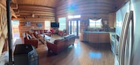 You will love the custom western decor with its attractive hand-peeled log furniture, dining table, chairs, and rustic aspen beds. The living room has a beautiful oak floor with three comfortable leather couches, seating for 9, situated around a 55" LCD flat screen TV with satellite service, Digital Video Recorder (DVR) and DVD player with surround sound.
