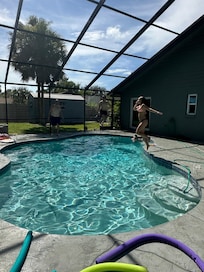 Beatifully updated pool home complete with two master suites that both have access to the pool. A fun double bunk room for the kiddos. Each bedroom has a ceiling fan with a remote. Plenty of room for families and large groups. Huge backyard, quiet neighborhood and private pool, two fire pits, corn hole boards and bags. The indoor shuffleboard table provides endless entertainment. The closet is full of puzzles and board games. Giant full size kitchen, completely stocked with everything you need. Dining room with seating for six and seating for four more at the kitchen island.Two car garage and plenty of driveway space to park multiple vehicles. We are pet friendly and have a fully fenced in back yard. There is a temperature controlled grill on the pool deck for the grillmaster in your group.There are Roku TVs in every room except for the bunk room. We are 6 miles from world renowned beaches, close to rowing facilities, big cat habitat, and museums. Many local breweries nearby. We provide beach chairs, an umbrella, a beach bag, and a soft cooler so you’re all set to to enjoy our beautiful beaches. There is a Target, a Publix, a Winn Dixie, and many restaurants 5 minutes away.