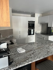 The entrance to the apartment (with a guest WC) leads to on the right one double bedroom with ensuite bathroom and a second twin bed bedroom with an adjacent bathroom, then a large living room, the kitchen and dining area and on the other side, one double bedroom with ensuite bathroom and a second twin bed bedroom with an adjacent bathroom. The brand new and well equipped kitchen has an electric oven with induction hob, microwave, fridge-freezer, full sized dishwasher, pantry cupboard, Nespresso machine (we do not provide the Nespresso capsules), toaster, electric kettle and coffee filter as well as all the usual cookware, crockery, glassware and a wine fridge. Next to the kitchen is a dining area for 10 and comfortable lounge area, smart TV, Bluetooth speaker and DVD player. There is a selection of DVDs, books and board games and a PS4. All the rooms have closets and there is a safe box in each double room of the room. There is a washing machine (combined dryer) in the apartment and large washing machines and dryers in the building. We provide with all the towels and linens, soap and shampoo, and a utility kit (one sponge, one kitchen towel, 2 garbage bags, and detergent).