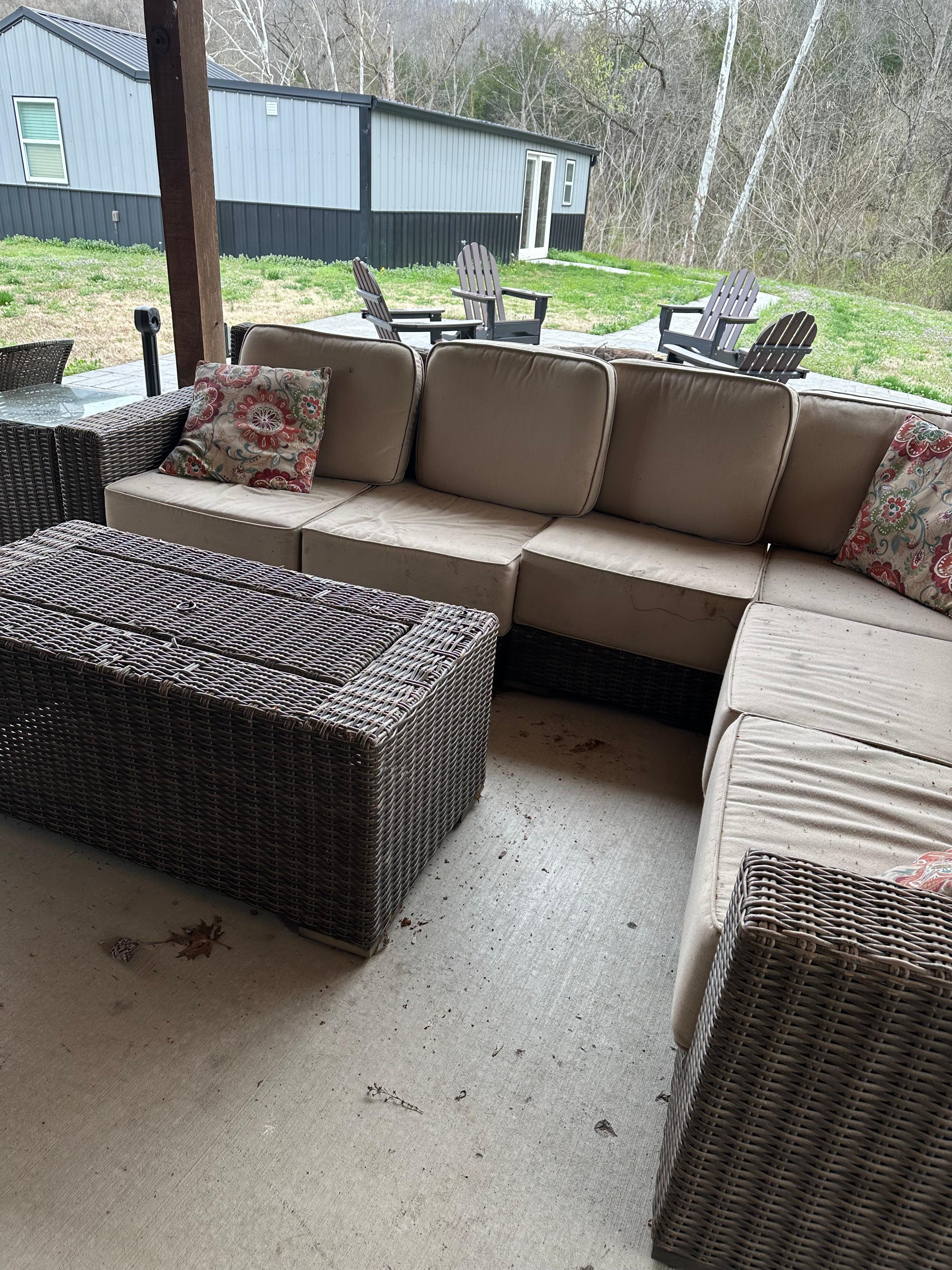 House outfitted with new linens, dishes, and appliances. The back patio is great for eating and visiting outdoors and also has a fire pit and TV. The front porch of the clubhouse has rocking chairs for everyone.