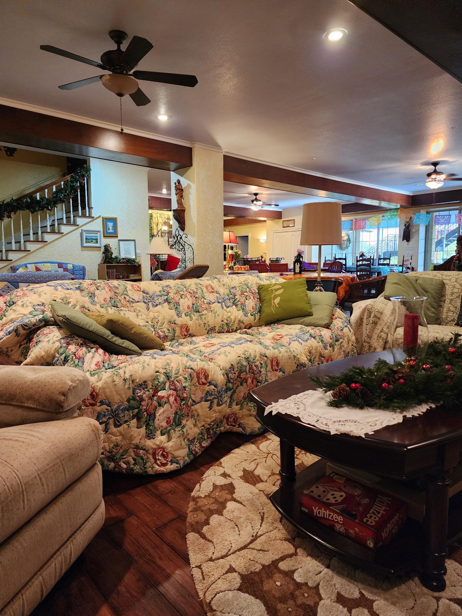 -Two living areas with couches/recliners/TV/Wifi and fireplace