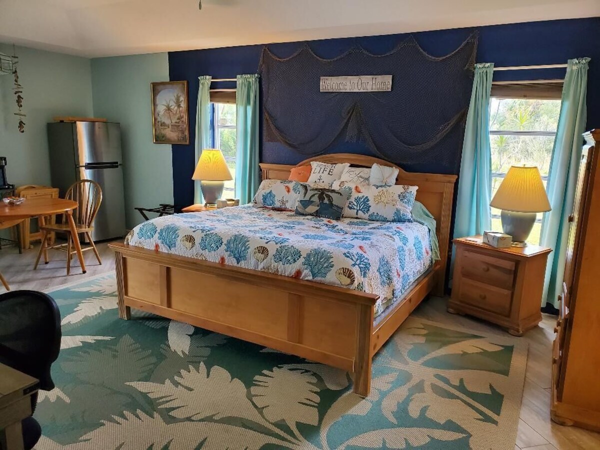 this tropical suite offers view of the coco plum canal ( yes there are GATORS) heated pool,hot tub and for your extended stays we have a kitchenette ( full size frigde, micro wave, kureg coffee maker with coffee, sugar,creamer and cups w/lids) air fryer/toaster/oven/roaster/ all in one. comfortable king size bed, linen and towels