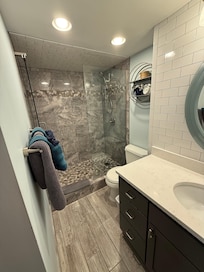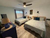 The bedroom has two queen-sized beds, a large dresser, a flat-screen television and its own bathroom. The bedroom has a ceiling fan and light along with sconce lighting over the beds on a shiplapped wall. A great convenience is the second full bath located off the hallway. Silky sheets and plenty of soft, thick towels make your stay more comfortable. We offer a wide variety of pillows (down alternative, medium, firm, and memory foam) to meet your preference.