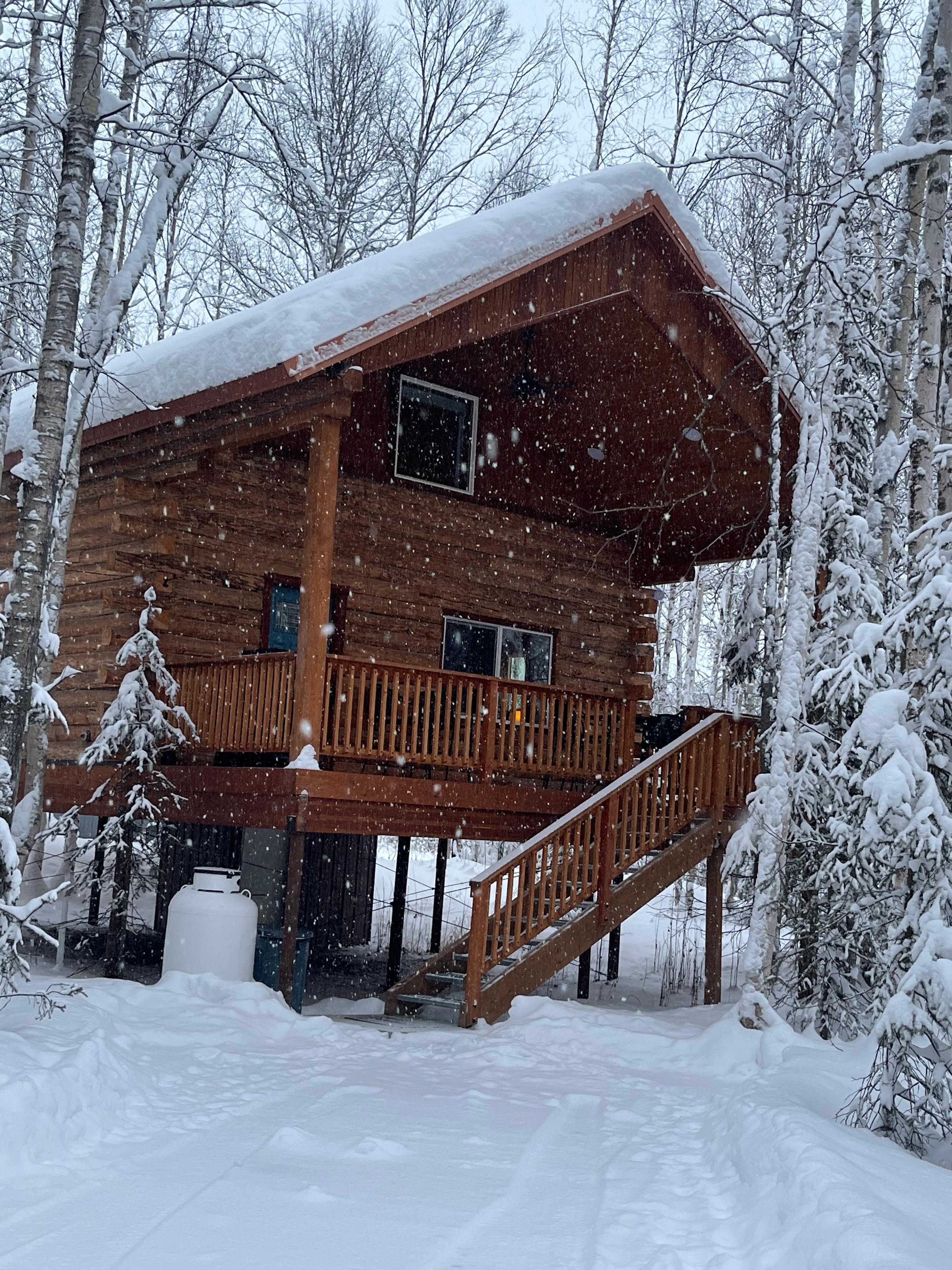 It features 17' cathedral ceilings, 2 comfortable king beds with memory foam mattress and a queen sleeper sofa, all with crisp linens, keyless entry, washer and dryer, copper sinks, hickory cabinets, blackout curtains, 3 smart TV's, Wi-Fi, large covered deck where guests can enjoy watching the Aurora Borealis (Northern Lights) in the winter or BBQ their favorite meats or vegetables, and a tankless water heater! The entire cabin is plumbed with a water filter and softer. There's a game table in the loft with a variety of games to choose from. With over 860 sq ft, there is enough room to bring your family and/or friends and stretch out and enjoy your home away from home. Moose love to meander through the property, so please keep your distance! Fishing is encouraged during the summer months. King salmon are catch and release only, silver salmon can be caught and enjoyed!