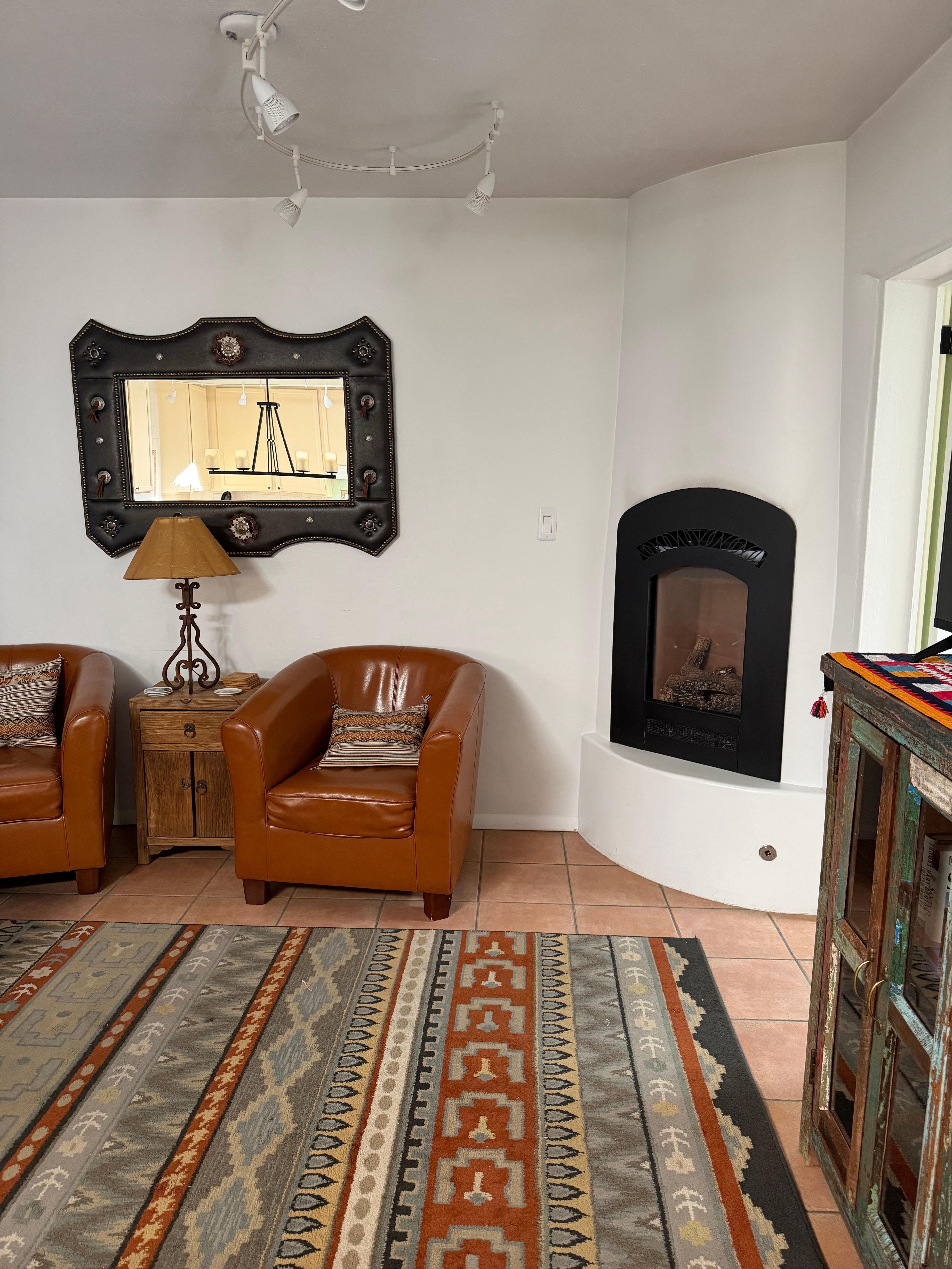 Unwind over dinner on the private front porch or relax in the secluded back garden/patio area after a day of sight seeing in Santa Fe. Or just relax and curl up next to the kiva fireplace to enjoy a movie or read a book.