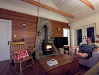 An expansive living room with a vaulted ceiling is furnished with pine Canadiana pieces for your comfort. Books, board games and videos are available to help you unwind and relax or share some laughs. The warmth of the wood burning fireplace will keep you cozy on those cooler days.