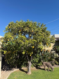 Step into the peaceful backyard adorned with an orange tree and a patio featuring outdoor dining for six, equipped with a BBQ grill that’s perfect for al fresco meals. Modern comforts include year-round air conditioning, high-speed WiFi, and a stacked washer/dryer. One dog is welcome with approval and fee, and there's a compact parking space in the garage. Don't miss out on creating lasting memories in this enchanting vacation retreat!