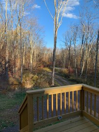 We keep the outdoors wild so, through the large double glass windows, you feel surrounded by the woods. Our trees are mostly deciduous with fall foliage colors in the bright yellow to reds, sunny winters, and wild ferns under the canopy shade in the summer.