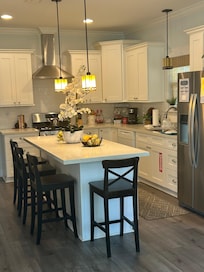 Has an island that also serves as a breakfast bar with seating for 4. Our kitchen is stocked with pots, pans, dishes, silverware, cups, cooking utensils, coffee pot, and more to make cooking any size meal a breeze!
