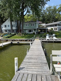 Our property provides several different ways you can relax and/or entertain. MAKE SURE TO CONTACT ME FOR A LINK TO VIEW A VIRTUAL TOUR OF THE PROPERTY. The adjacent patio connected to the house is sheltered from the rain and sun; this is where you’ll find one of the cooking grills with a ceiling fan to provide a breeze. Toss the bean bags, play catch, or throw a Frisbee on the front lawn in a shaded area under the trees or closer to the water in the sun. Or walk down a few steps and sit down in the sun garden with a cold beverage and just take everything in, enjoying nature at its best. You can lie on the raft and bob around with the waves, sit on a bench at the end of the pier, maybe drop a line, or lounge in a chaise on the 8'x16' sun deck above the water. Count on some wave sprays coming off the seawall to cool you off as the boats pass by! For some exercise, the path around the lake is just shy of 4 miles. You can make it shorter depending on your preference, but it is a wonderful outdoor workout, casual walk or bike ride. For those looking for water toys, bring your own or there are local rentals available by the day or week. There are 4 augured poles just off the pier to moor your boat or PWF