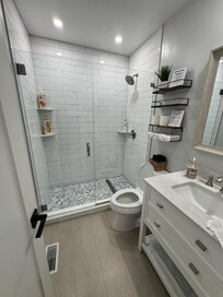 • Full bath with beautiful, tiled shower with full glass doors. Quartz top vanity