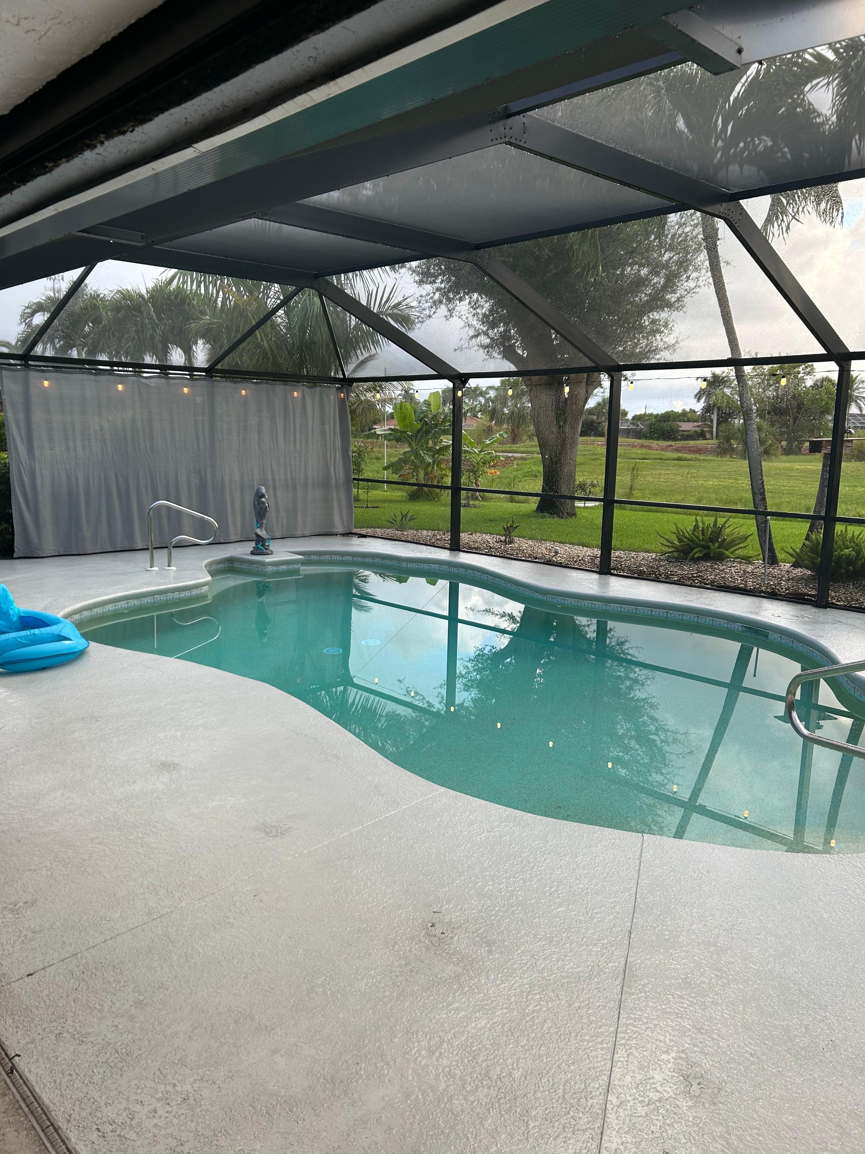 Relax with the whole family in this freshly renovated Pool home surrounded by a private park-like setting. It can't get more serene with unobstructed views of Cape Coral's largest green belt. Lots of privacy on a large sundeck in a newly screened-in pool that is comfortably heated through solar and an electric pool heater. Small fishing pond right in your backyard. Weber Outdoor grill, sun loungers and a large private Tiki lets you connect with nature and enjoy the sunset and outdoors.