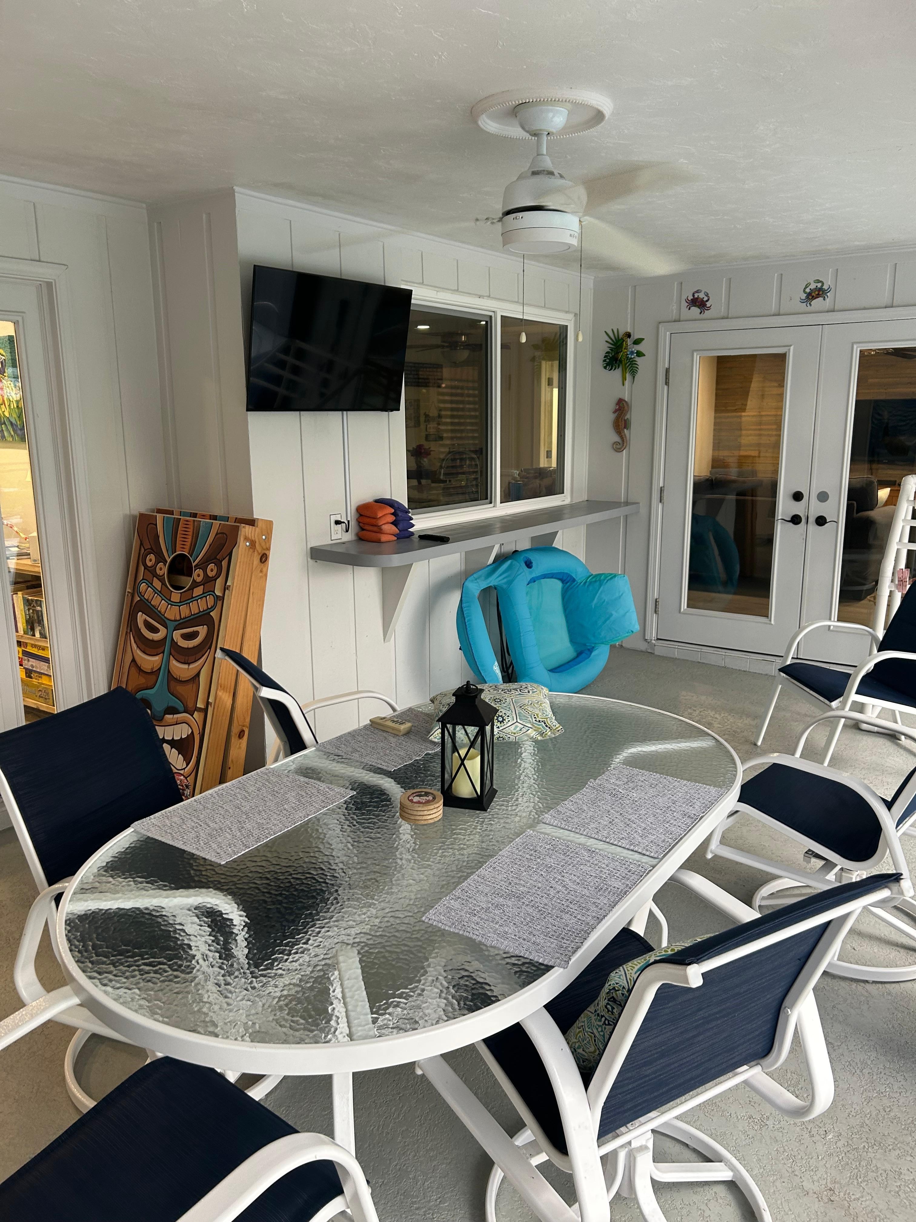 Accessible through the Lanai awaits a uniquely decorated and stunning Tiki hut with additional seating, remote controlled fan and lights. THE BEST place to enjoy the sundown with your favorite beverage.