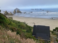 Stay in a piece of Bandon history! Mere steps from the beach, the 1930’s era Barton Cabin has been recently remodeled, featuring all-new modern amenities while maintaining its original rustic feel. Everything about the cabin is cozy, with one bedroom and bath upstairs (including a queen bed and compact washer and dryer) and one tiny bedroom downstairs (also with a queen bed) along with a second bath and fully equipped kitchen. Located 3/4 of the way down the bluff, it’s sixty stair-steps from the parking area to the cabin, but it’s worth the walk: the cabin has private beach access a few more steps further down, shared only with one set of neighbors. The views from inside and out are as good as any beach views in Oregon; sit on the couch or deck and watch the surf crash into rock formations from Face Rock to Elephant Rock. The neighborhood is friendly and walkable. Lord Bennett’s restaurant is practically across the street, and the shops and restaurants of Bandon are all only a mile away.