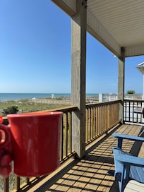 Come relax and enjoy our beautifully decorated oceanfront and spacious home. It has a large well equipped kitchen with granite counter tops and beautiful hardwood floors. Both the dining area and family room seats 10 comfortably and has great ocean views. You can enjoy your morning coffee and afternoon drinks while relaxing on our large porch or large deck. On the porch there is a dining table and rocking chairs to relax in. On Thursday nights you can watch fireworks from Carolina Beach from our deck. We have ceiling fans in all of the rooms. There are queen beds in three bedrooms and the remaining two have twin beds. There is WIFI throughout the house along with a TV in each room with ROKU to play SPECTRUM and NETFLIX. Other features include an enclosed outdoor shower with hot and cold water, which offers a refreshing place to wash off after a day on the beach. We also have a private walkway to the beach. Linens and cleaning service are provided. A gas grill is available for your use. Enjoy a family game in the house or a game of cornhole outside. We have a large private lot for parking 6 or more cars. The Carolina Beach boardwalk offers shops, restaurants and summertime activities such as festivals, fireworks and live music. The NC fort Fisher Aquarium is a great place to enjoy the afternoon. Also, Southport is just a ferry ride away. Kure Beach offers a market each Tuesday with different vendors.