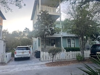 Nestled in the Summers Edge community along Scenic 30A, Five O'Clock Somewhere is a charming three-story vacation home painted in serene pale blue with white trim. This gracious Old Florida-style residence accommodates up to twelve guests across four bedrooms. It features columned upper-level verandas overlooking a yard framed by Magnolias and a classic white picket fence. Just a short stroll from the sandy shores and a unique coastal dune lake, guests can enjoy the beach, fishing, paddleboarding, and kayaking in a picturesque setting. The community also offers two swimming pools, one of which is seasonally heated.
