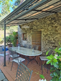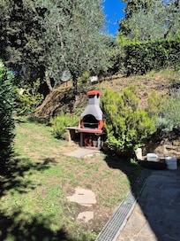 As soon as you arrive you can already breathe the flavour of the grass, flowers, trees, Mediterranean vegetation. You are in the private garden (300mq) of the house; just a few steps, ahead 50m, there is the swimming pool (5m x 10m) with sun terrace equipped (parasols, sunbeds, gazebo) ideal place where the guests can relax and appreciate the beautiful view surrounding you. In front of the villa, there is a nice patio where you can enjoy your meals. The House (200sq m) has two floors. When you enter the front door, you are welcomed by a cosy kitchen, continuing we arrive into a comfortable living room. It has a panoramic arched glass door that opens out onto the front patio. A door in the living room opens into living/dining room with kitchen corner, a fireplace and double sofa bed. A glass door in this room opens onto a paved furnished side terrace with tables, chairs and barbecue.
