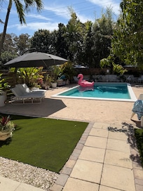 • Heated backyard pool surrounded by palms