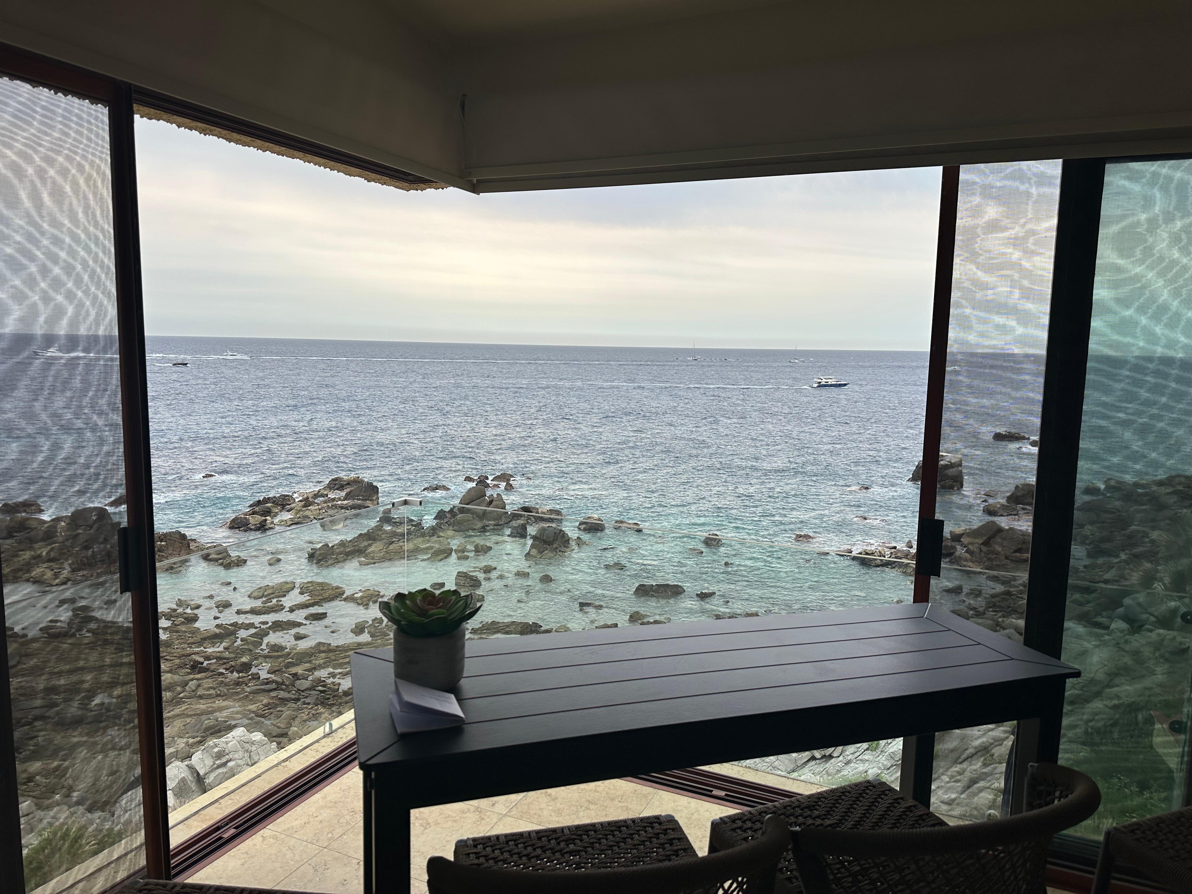Just before you arrive at this oceanfront building, you’ll pass the heated pool and the bar/restaurant where you can book all your Cabo activities while having food and drinks and meeting new friends.