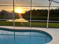 Originally a show home by the estate developers, this oversized (2,100 sq. ft.) villa faces a large lake and conservation area. Eagle Pointe is a peaceful community, yet is only 5 minutes (via Poinciana Blvd) from the hundreds of tourist (shops, restaurants, bars) facilities on Highway 192, which leads straight to DISNEY WORLD, which is a GENUINE total of 14 MINUTES DRIVE from the villa. Fully equipped and air conditioned, each room also has cathedral ceilings with fans. Two bedrooms have queen size beds and the other two have twin beds. The living room and dining area leads to the family room and second dining table. The kitchen and separate laundry room have all necessary modern equipment. The games room has a 7 foot pool table, table football, dart board, radio/ CD player, sofa and chairs. The screened swimming pool, resurfaced in October 2021, can be heated (additional cost applies - see below) and is equipped with modern patio furniture. Other facilities include 4 cable TVs, DVD player, hi-fi system, telephone (free USA/Canada calls), clock radios, a safe and alarm. The local management company are available 24/7.