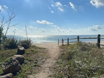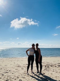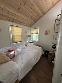 It truly is all about the beach in this classic, bright and airy North Fork beach cottage that is just a two minute walk to our stunning and private sandy Bay beach. Our home has been updated and offers both a huge screened in porch and a beautiful back yard deck. Just steps to one of the most coveted Bay beaches on the North Fork, our cottage is also conveniently located to any shopping you might need just up the block. You'll be within mere minutes to North Fork favorites like Love Lane and the many countless vineyards that now dot the Fork, yet a world of peace awaits you at the calm and sparkling private, sandy association Bay beach just 500 feet away. Enjoy indoor~outdoor living at its best as our vaulted living room with skylight and ceiling fan has french doors to a huge, welcoming screened porch. The charming porch has a massive oak picnic table that seats 12 and a large separate sitting area. Galley kitchen has a large french door refrigerator, coffee maker, microwave, dishwasher and gas stove. House offers high speed wifi for work at home, and desk. All rooms offer ductless AC. Primary bedroom has a king size bed, ensuite bath with shower and sliding glass doors to the beautiful and private backyard cedar deck, as well as a small tv, and a toddler fold out sleeper chair. Second bedroom has queen bed below and an attached loft with queen mattress. The loft area is suitable for older children or teens. There is a convenient laundry room with new LG washer and dryer set. The private, fully fenced backyard offers a sunny outdoor shower you will want to live in, a fire pit area, and of course a lovely hammock. Deck has BBQ, dining table (with umbrella) that seats 6 and chaise lounges for relaxing. Our garage has been renovated into a lovely she-shed (available in-season only) suitable for yoga, quiet work from home, or just an extra hang out space, complete with powder room and AC. (Sleeping overnight in the she-shed is not permitted, and if used, must be left in condition found.) Conveniently located right up the block you'll have access to a Starbucks, CVS, grocery store, and a variety of local shops and restaurants. At the top of the block, the famous Magic Fountain ice cream shop awaits your visit! On the charming Love Lane in Mattituck you'll find a Godiva candy shoppe, a world class cheese shoppe, wine tasting, Lombardi's specialty food market and brick oven pizza and of course, the renowned Love Lane Kitchen restaurant. There is also a Jitney stop at the top of the block and the Mattituck train stop adjacent to Love Lane. Just around the corner, beachside, children may enjoy the Veteran's Beach playground, while pet parents can walk the lovely Husing Pond Preserve Trail. Rental includes use of 2 adult cruiser bikes as well as an ocean kayak and stand up paddle board which are kept right on the beach for easy access in season. (Please request lock codes for use. Renter assumes ALL liability for water toys and bikes.) Beach shed is equipped with vests, chairs, umbrellas, boogie boards, and a large dolly to roll all to the beach.