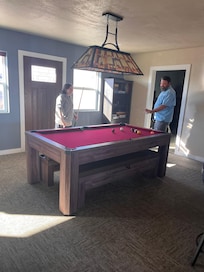 Game Room: The game room features a pool table, darts, games, and puzzles. The pool table also converts to a table for games, puzzles, or extra dining space. It is open to the kitchen and living room for easy social interaction with your family or friends.