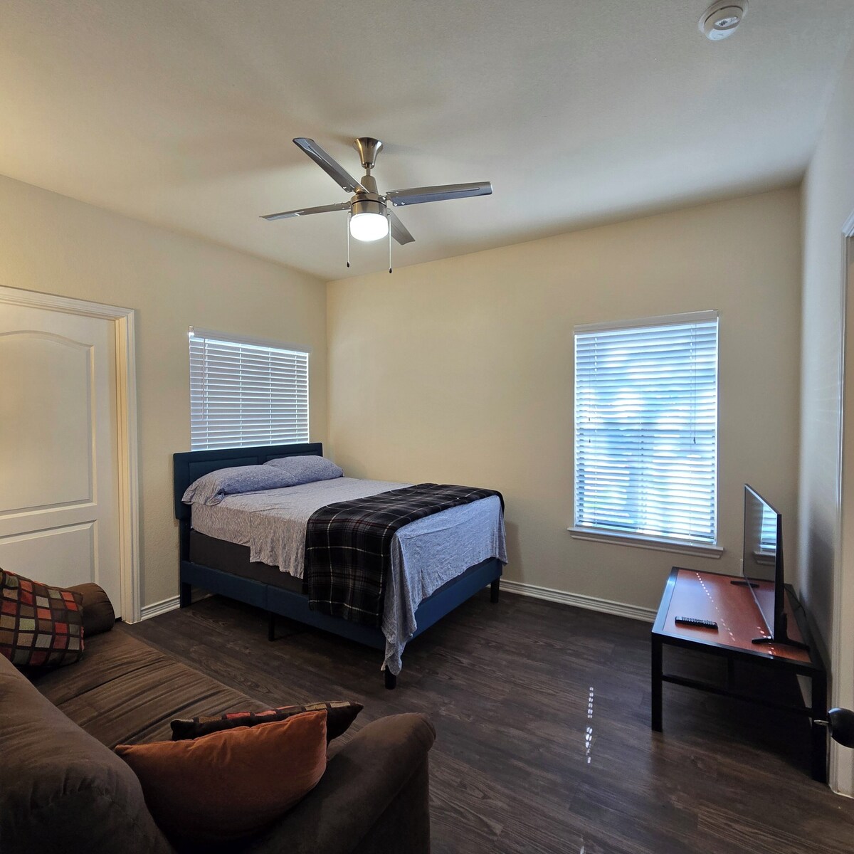 Comfortable Room with Private Bathroom, Perfect for Travelers in apartment in Austin. This adorable space features a cozy full bed, perfect for a good night's sleep. With heating, A/C, Smart TV and Wi-Fi service, guests can stay comfortable and connected. The bathroom offers both a shower and bathtub for a refreshing start to the day. A brilliant choice for solo travelers or couples looking for a pleasant retreat in the heart of the city. A great place to call homebase while you're away, we hope you enjoy your stay.