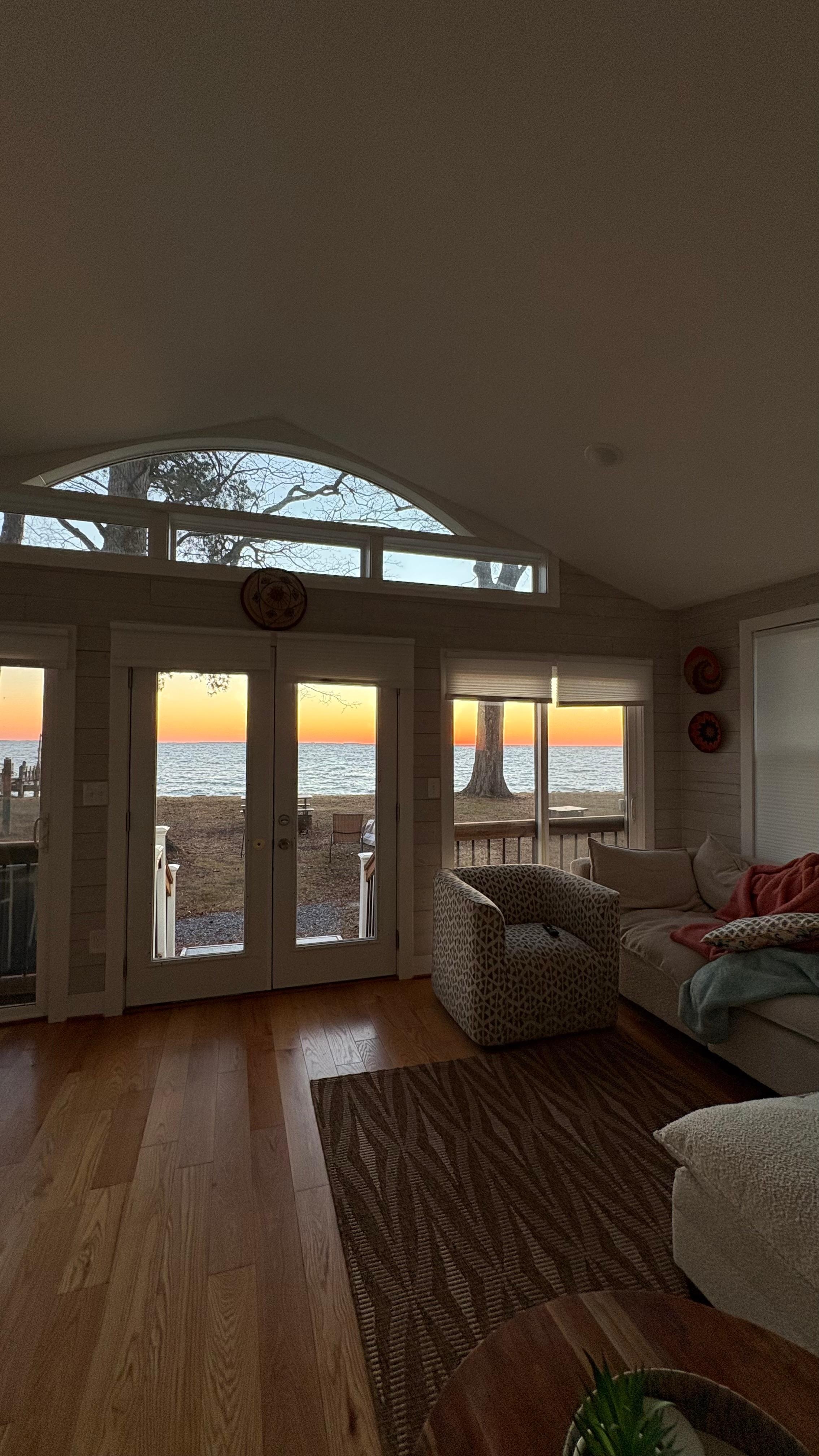 **Stunning Views:** Enjoy breathtaking sunrises and sunsets over the Chesapeake Bay from living room and dining room with full floor to ceiling windows/doors and a large picture window, complete with comfortable seating for morning coffee or evening cocktails.