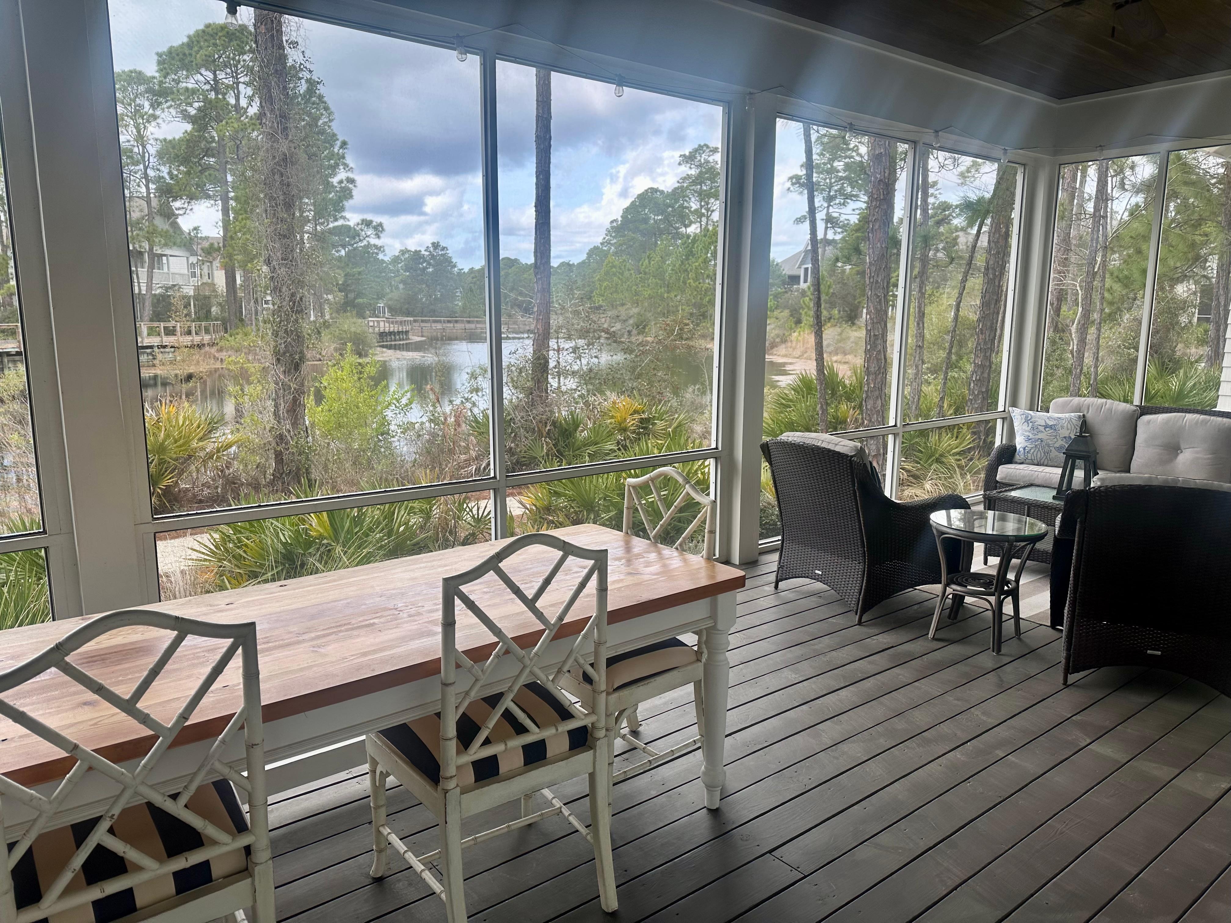 This lovely cottage boasts breathtaking lake views from its balconies and a screened-in main-level porch, providing a serene escape after a day of beach adventures or exploring the charming villages of 30A. The open floor plan, adorned with coastal décor and modern finishes, creates an inviting space for families and friends to gather and relax.