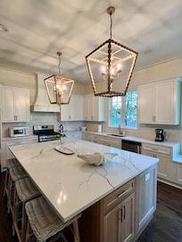 Welcome to The Alice Palace! Stay comfortably at this lakefront home in this 4-bedroom house. With 1 king bed, 2 queen beds, and 2 bunk beds, guests will have plenty of space to relax. The open floor plan property features 4.5 bathrooms with amenities like a hair dryer and shower. The kitchen has a large eat in bar. Eat dinner or enjoy coffee on the huge screened in porch. Dock has a sundeck and covered area to enjoy the Lake Blackshear sunsets. Make use of the Peleton Row in the upstairs loft. Book now and enjoy everything this peaceful house has to offer. New construction.
