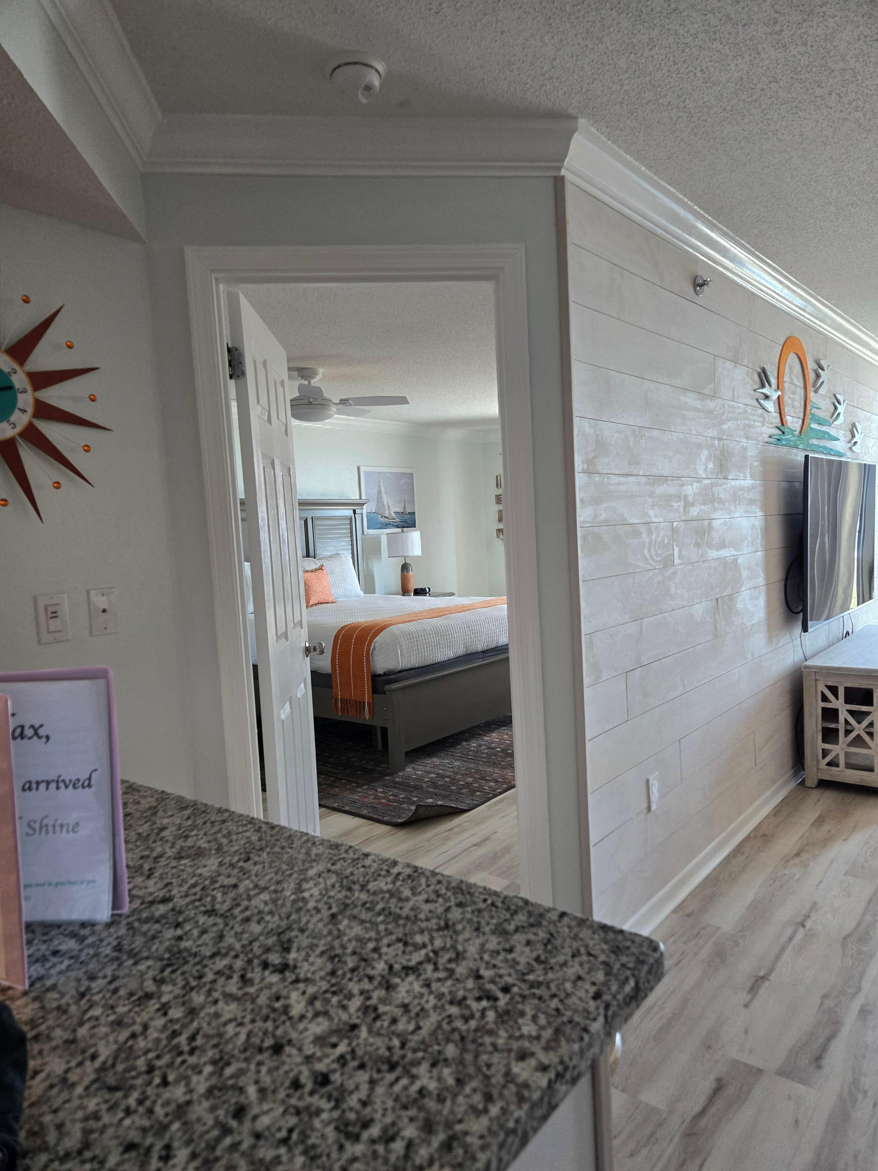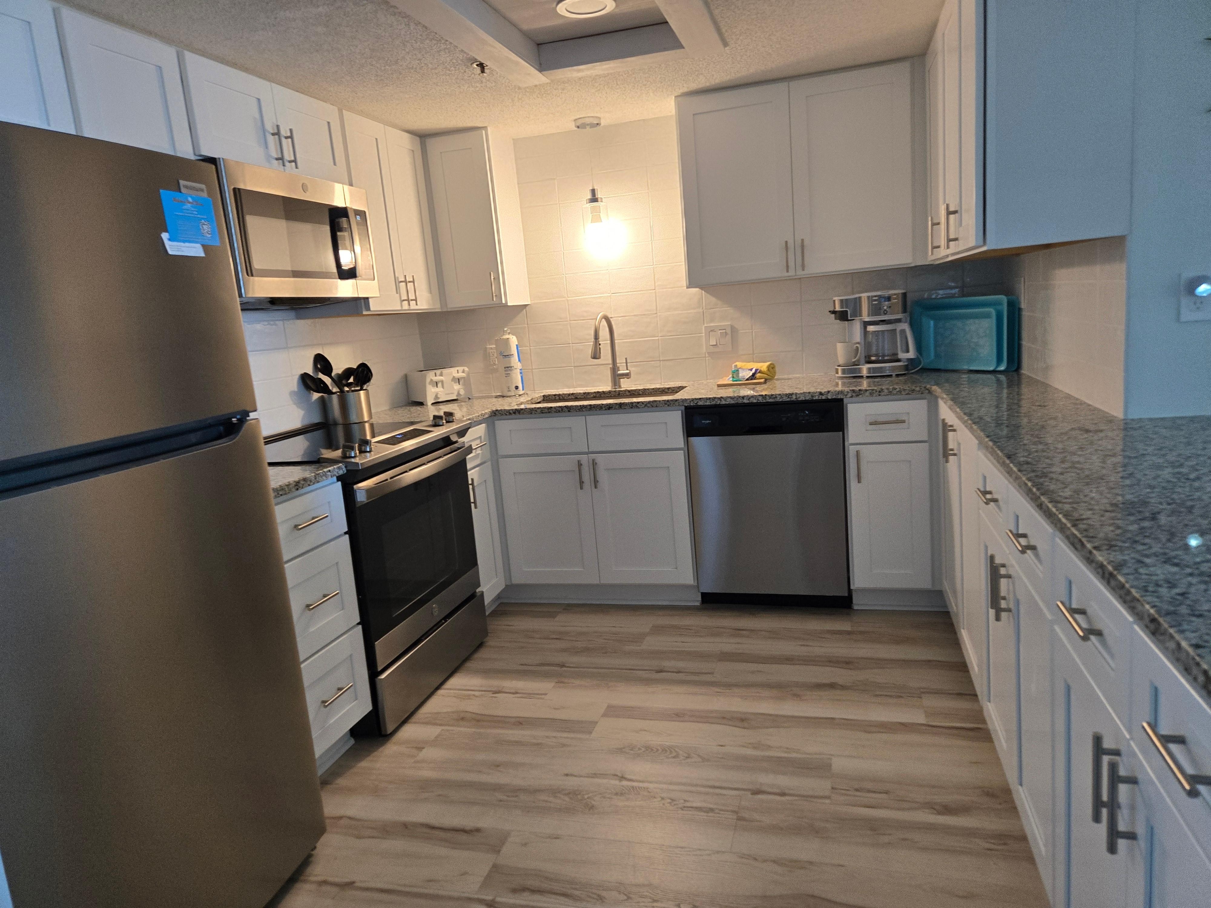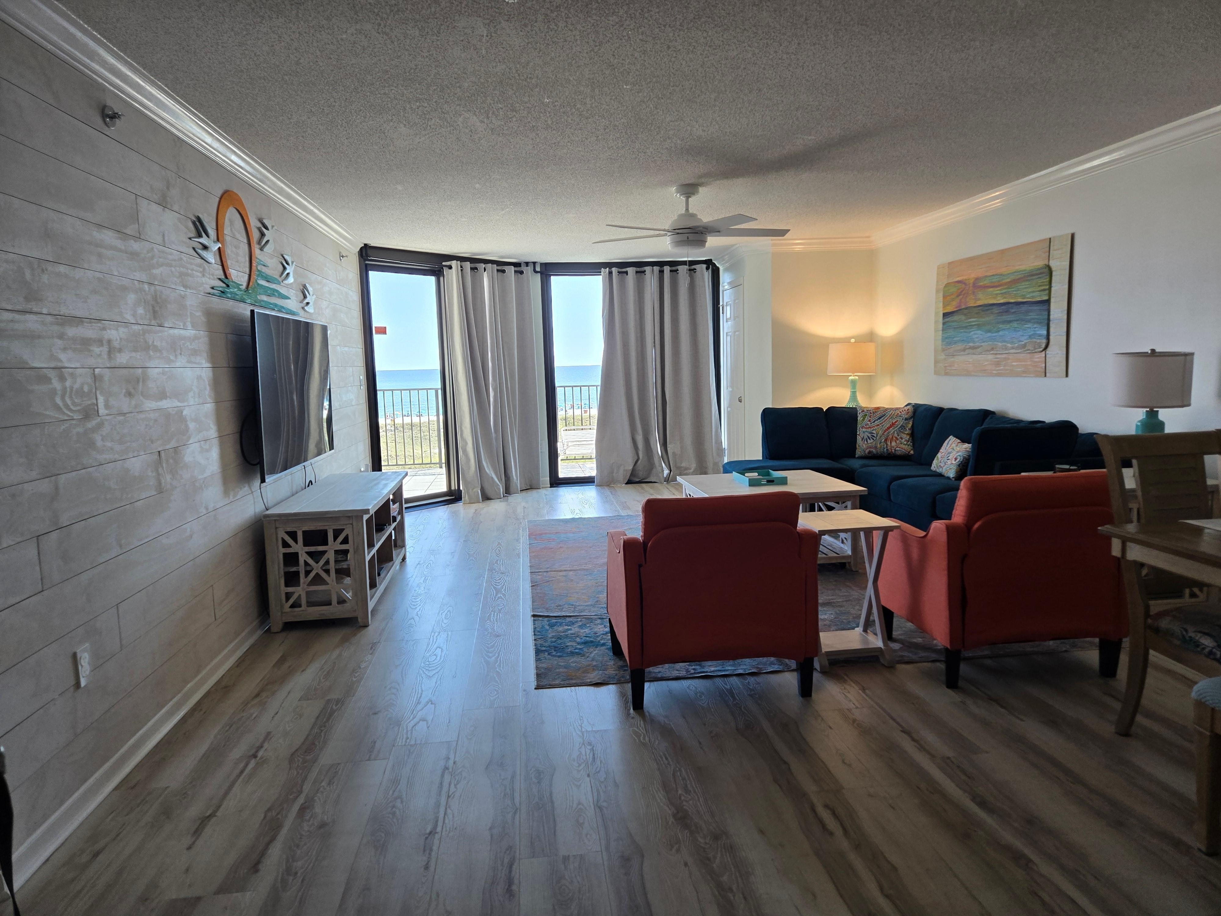 Entertainment is a priority, with a 70" SMART TV in the living room, a 50" SMART TV in the master bedroom, and 40" SMART TVs in both the second and third bedrooms. The unit has been fully upgraded, with new beds, contemporary living room furniture, granite countertops, new floors, and a walk-in master shower, ensuring a stylish and comfortable stay.