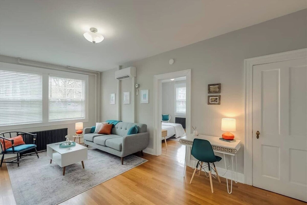This historic gem is a few blocks in either direction from the State Capitol and downtown Frankfort. The 1930's brick building is stylishly renovated and historically preserved. This one-bedroom apartment has a separate living room and a bedroom with queen-sized bed and fluffy linens. The carefully restored Art Deco bathroom has hotel-quality towels. The freshly remodeled kitchen invites you to sip coffee. Blackout curtains and sound-insulated doors will help you sleep peacefully.