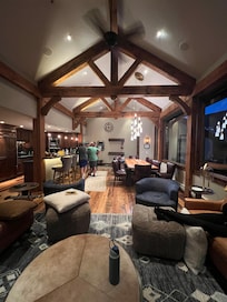 Upon entry, the open floor plan welcomes you with an atmosphere specifically designed and decorated for comfort and luxury. A custom burled walnut inlay table for twelve sits in front of the windows that span into the living room, where large sofas and chairs, a 3 mantle gas fireplace, a flatscreen television, and a wet bar with its own fridge and ice maker await for relaxation and entertainment. The gourmet kitchen with leathered granite counter tops, freezer space cleverly disguised as drawers, and duel ovens overlook the entire floor with its reclaimed structural trusses and amazing view. An additional breakfast bar has seating for six people.