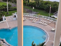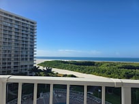 OUTDOOR LIVING: Private patio balcony w/ seating, ocean & pool view