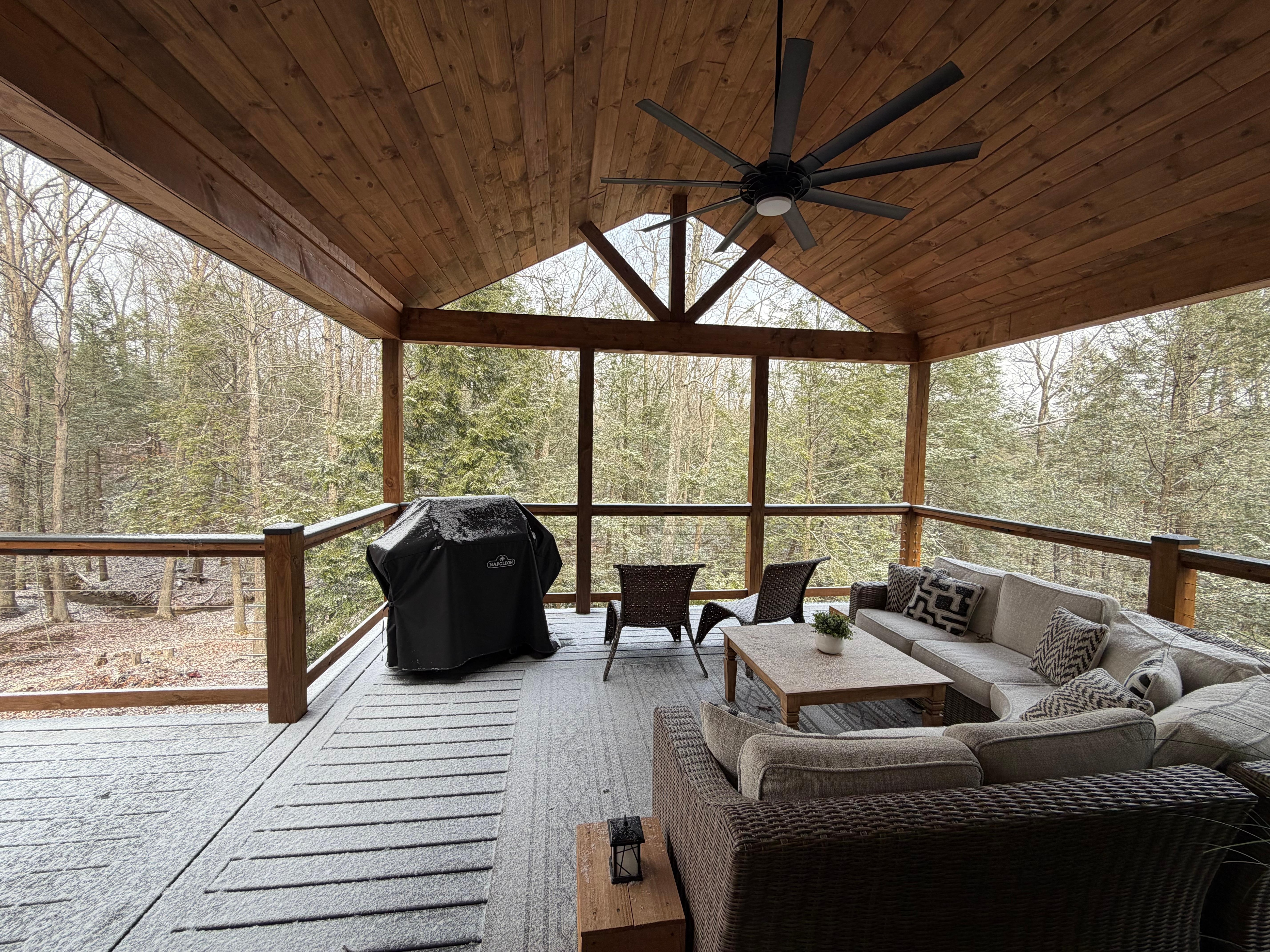 - Covered porch with seating and forest views