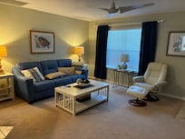 The second living room, connected to the sunroom, offers a quiet retreat with plush sofas, an additional TV, ceiling fan, reading lamp, and a selection of books, board games, and playing cards.