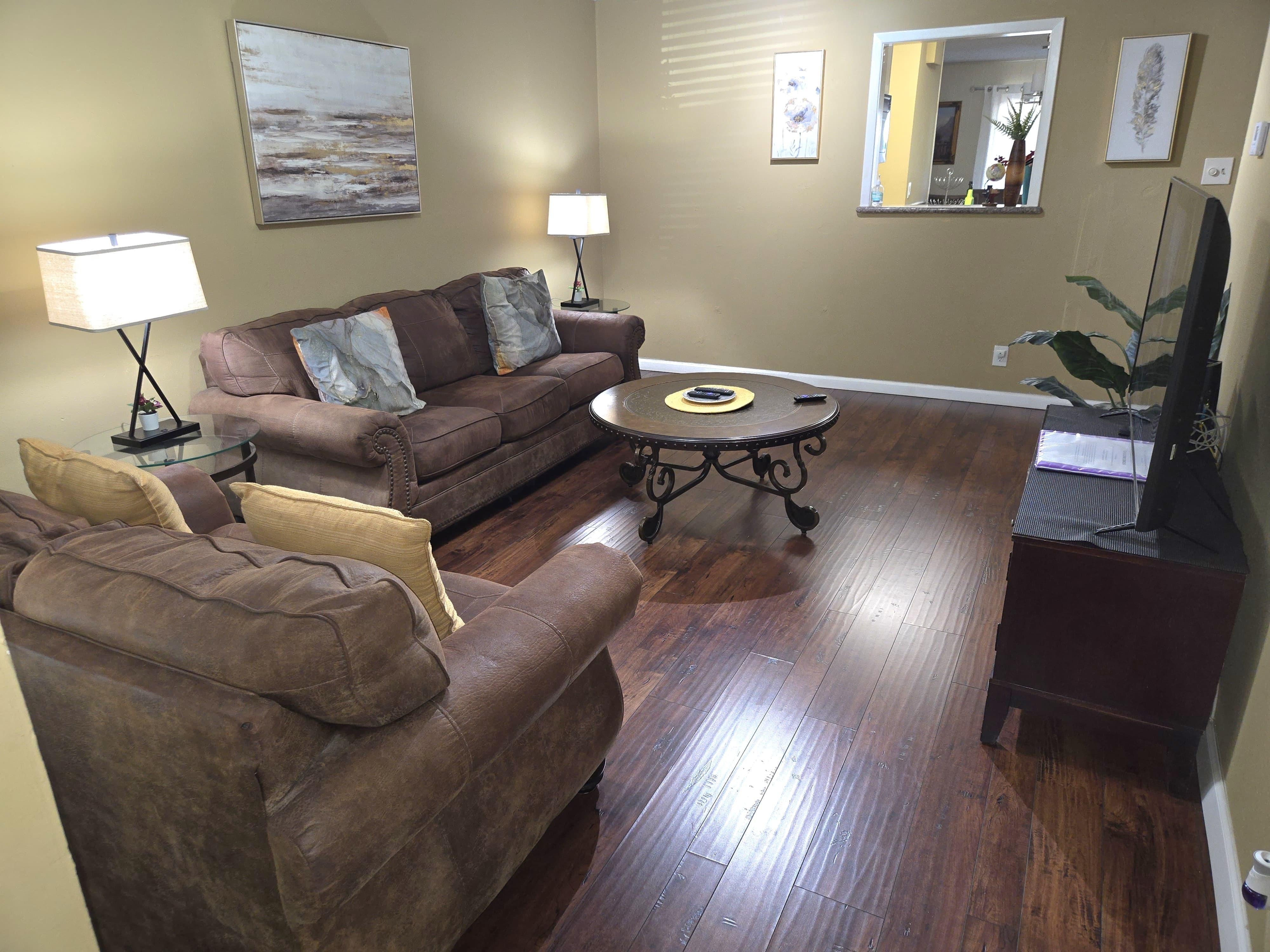 The living room has a comfortable leather sofa and love seat and a 55" smart TV where you can stream your own Netflix or other favorite streaming service (no cable). Each of the bedroom also have smart TVs for streaming. The kitchen features stainless steel appliances, granite countertops and is fully equipped with a drip coffee pot, blender, toaster, pots, pans, plates and silverware for 8 people.
