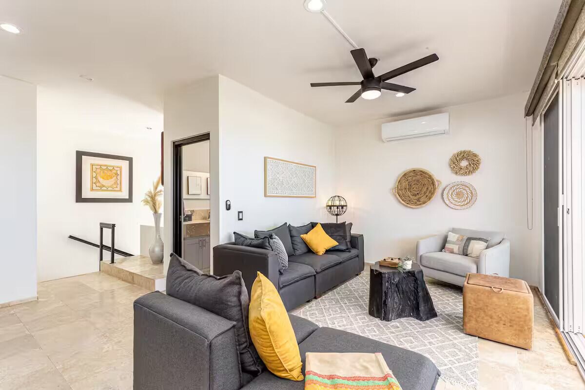 The casa welcomes you with the main living and dining space upstairs , providing stunning views of the surrounding ocean and city lights of downtown Cabo San Lucas! The expansive terrace is perfect for relaxing , or dining al fresco. Living space features Roku smart TV ,FREE WI-FI, board games, books and Yoga mats. Their is a convenient half bath upstairs off main living area.