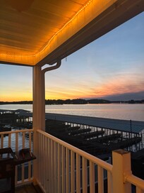 Outdoor Living: A private terrace/balcony overlooking the water, equipped with seating for sunset watching.