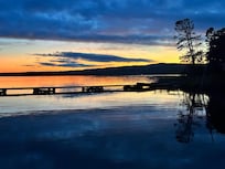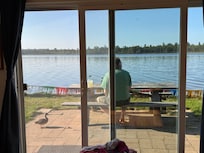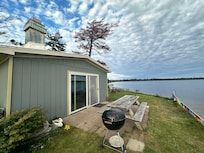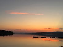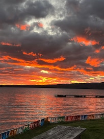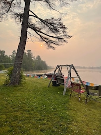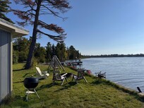 Lots of windows offer a great view in any direction. Sliding screen doors open to outdoor patios. Perfect peninsula location to watch the sunrise, sunset and moon rise. Adirondack chairs, lawn swing and a fire pit for those evening s’mores. Good swimming, sandy bottom. Fish for perch, bass and pike from the shore or dock. Charcoal grill for that tasty fish dinner.