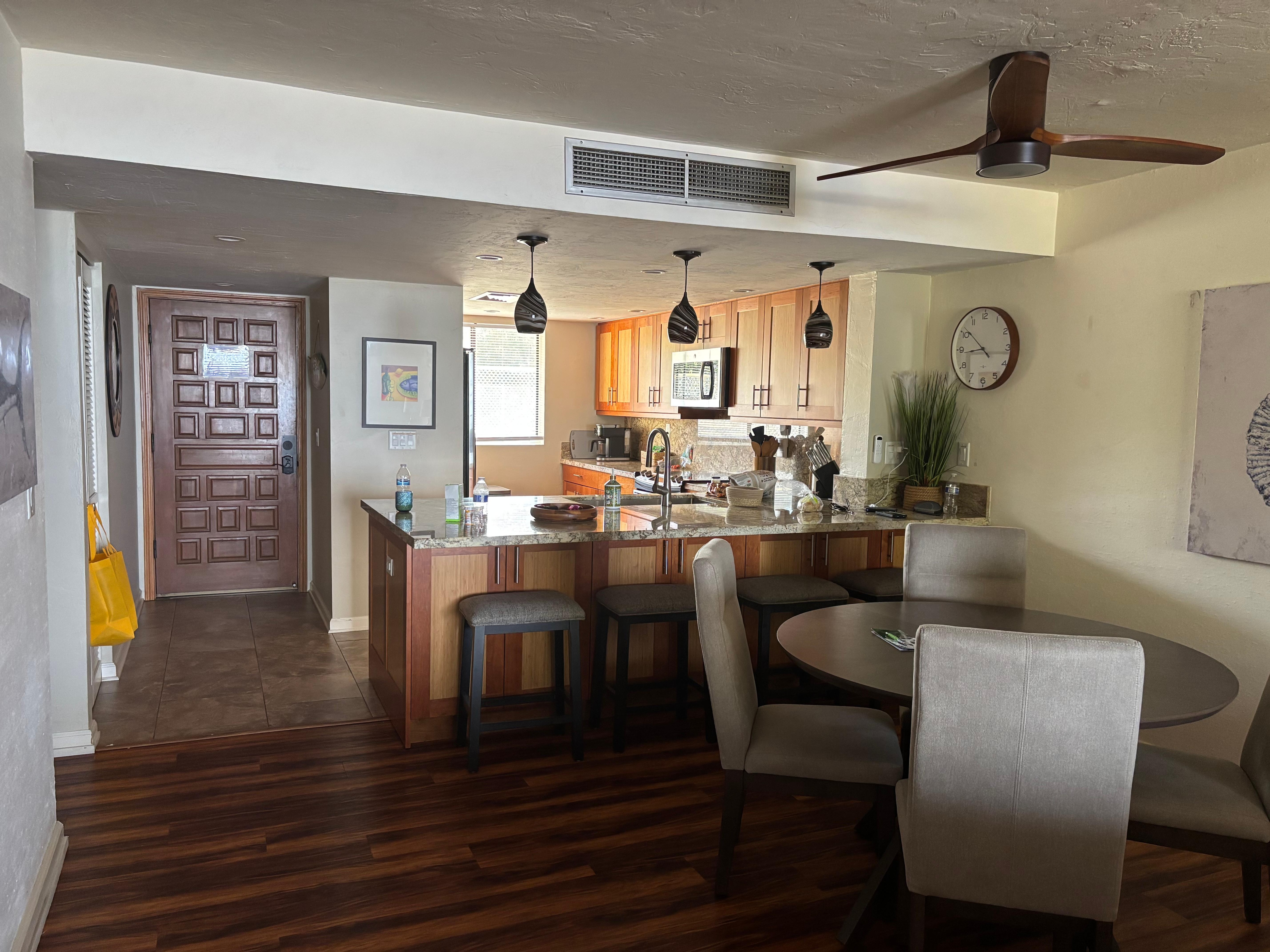Enjoy stunning ocean views from this spacious 2-bedroom condo with king beds, a private lanai, and central air conditioning. Sleeps 4 comfortably, with an air bed available for a 5th guest. Relax by the pool, hot tub, or enjoy games like ping pong and pool, oir make use of the small workout room. Also, tennis courts! Steps from Banyans Beach surf break, a local taco truck, and a weekend fruit market. Free reserved parking included.