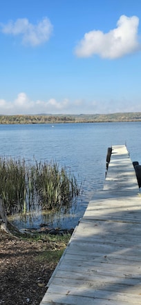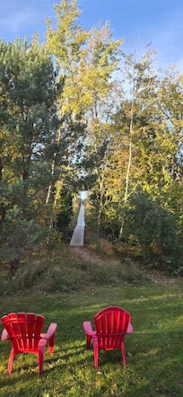 A short walk along a boardwalk through a protected natural area leads to the lakefront amenities. This path typically takes about two to three minutes for healthy adults and children. The home sits on a slight grade, so the walk back may take a bit longer for guests with mobility or health concerns.