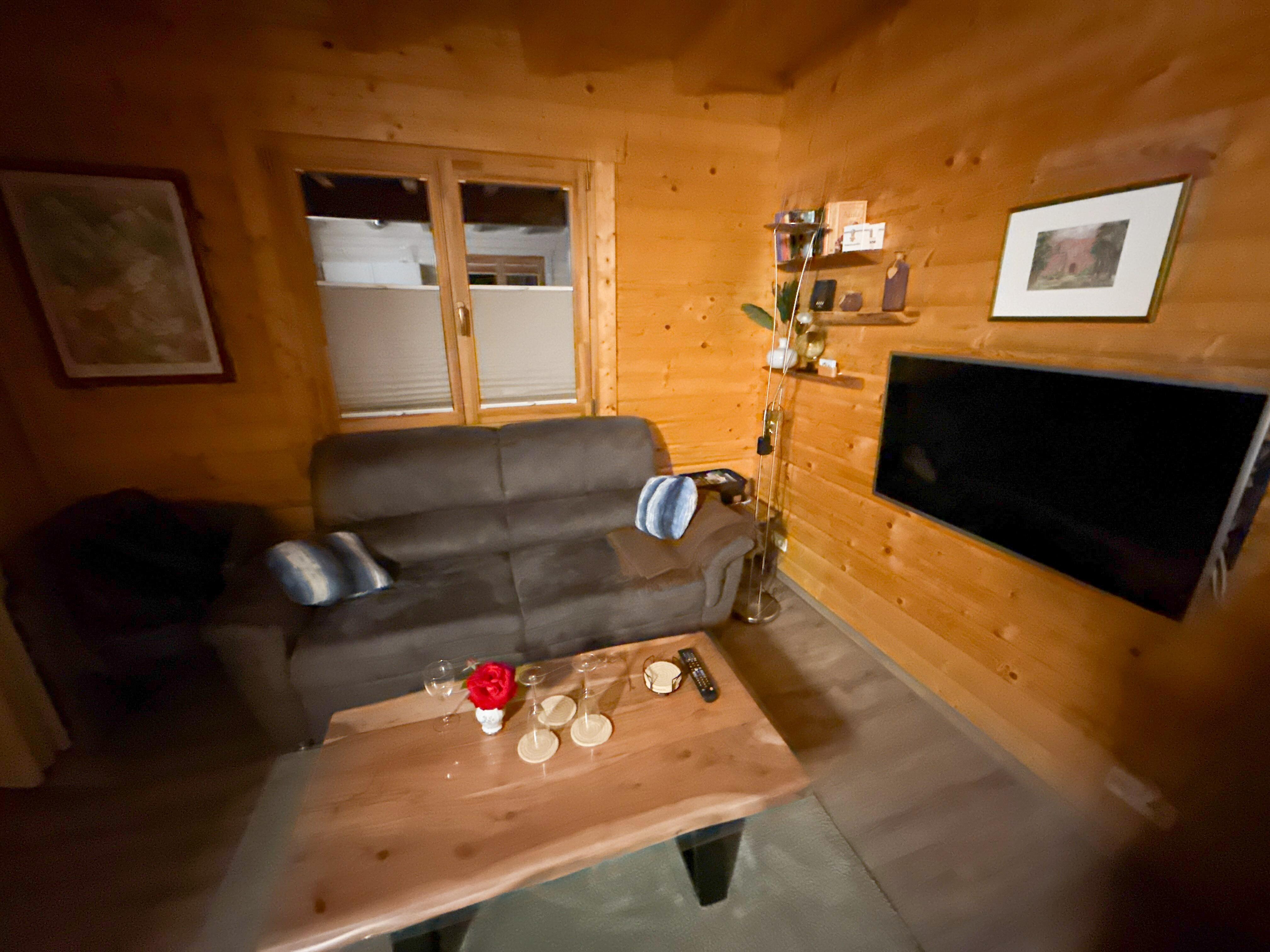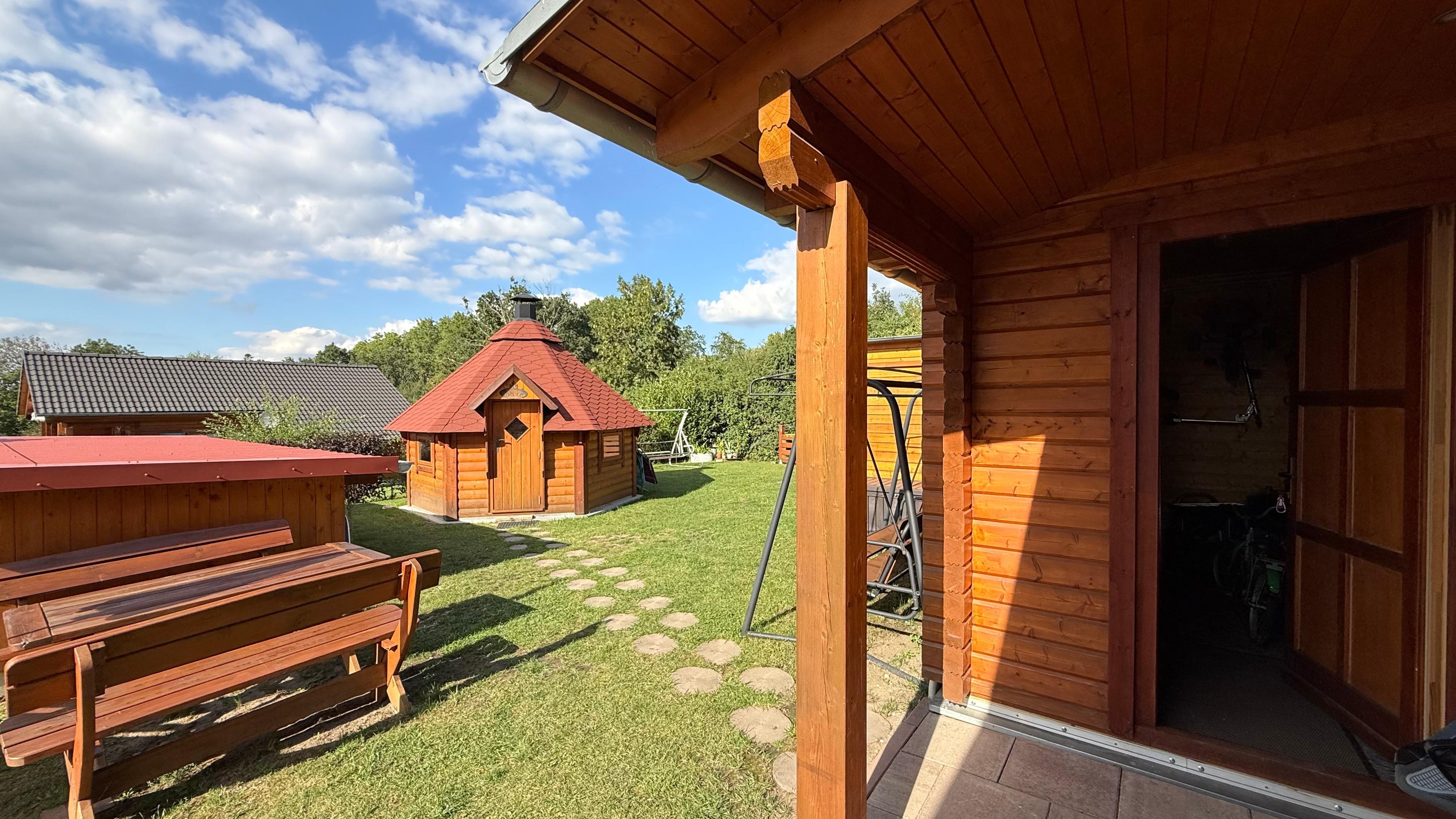 The holiday home, newly built in 2019 in log cabin style, is located on a 500 sqm large and separate recreational plot within a small holiday home settlement away from the village of Groß Nemerow in the district of Tollenseheim, only approx. 100 m as the crow flies from Lake Tollensesee. The natural bathing beach and the jetty can be reached in approx. 500 m, a golf course in approx. 300 m. The holiday home is modernly equipped and extends over 2 living levels. On the ground floor there is the living room (upholstered seating area, dining table, LED TV, radio, air conditioning) with an open-plan kitchenette (electric cooker with oven, dishwasher, microwave, fridge with freezer compartment, various kitchen appliances), 1 bedroom (double bed, TV) and a bathroom (shower/WC, washing machine, hairdryer). On the upper floor there are 2 further bedrooms, each with a double bed (1 x with furnished balcony), as well as a small guest WC. Heating is provided by electric heating and a wood-burning stove in the living room (initial supply of firewood included), carport and 1 additional parking space, bicycle storage room (charging facilities for e-bikes available), furnished terrace, sun loungers and barbecue facilities. A total of 5 bicycles (including 2 children's bikes) are available free of charge. A high chair and a cot can be provided free of charge for small children.other chargeable offers on site:- Dinghy for max. 5 pers. without motor 15 EUR/day or 60 EUR/stay- 2 stand-up paddleboards (30 EUR/stay each)- Grill Kota for 12-15 pers. Bed linen and towels can be rented or brought along. The total price includes final cleaning, electricity, water and W-LAN. For a second pet there is a charge of 5,00 EUR per night.
