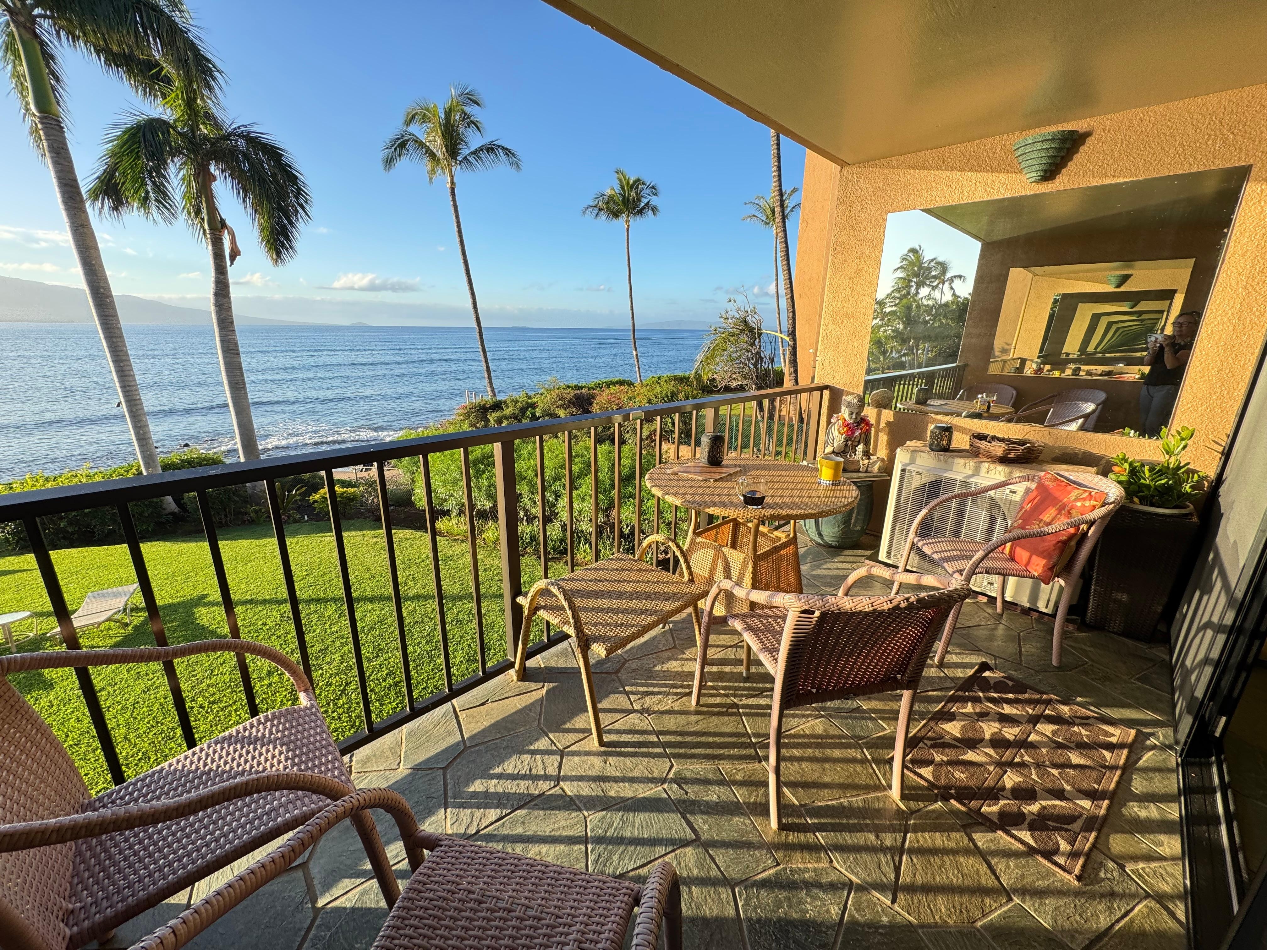 The condo itself is a true oasis, featuring a fully stocked kitchen with a stove, oven, refrigerator, and all the essential appliances and utensils you'll need to prepare delicious meals. Savor your morning coffee while taking in the stunning ocean views from the porch(Lanai), or enjoy a peaceful evening outdoors. With air conditioning, linens, and a hair dryer provided, you'll have all the comforts of home during your Maui getaway.