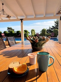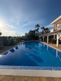 Light floods in from all angles.There is a covered seating and dining area near the pool plus plenty of sun loungers and umbrellas. The outside area has a large dining area with place for everyone as well as a relaxing area.