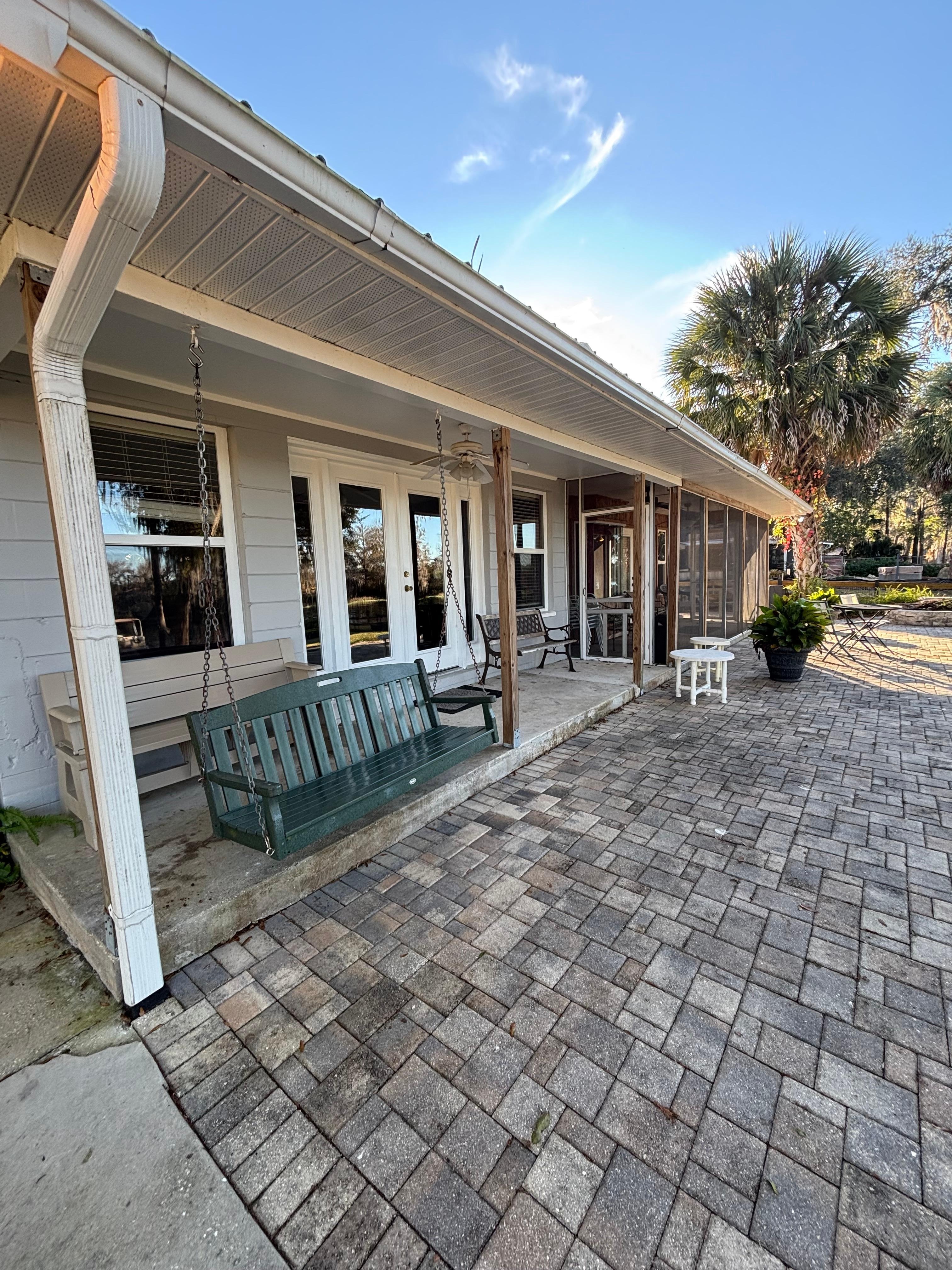 Old Florida stone columns outline the large open air carport. The walkway wraps around to the backyard which has a stone pavers courtyard complete with a wood burning fire pit and charcoal grill. The stone paver walkway weaves its way to the boat dock. The courtyard is perfect for a BBQ cookout, entertaining guests or just relaxing and watching the river flow by.
