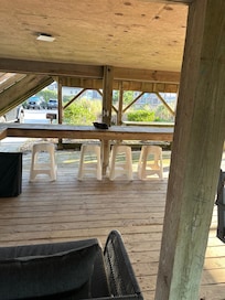 Each room has a wall mounted flat screen tv and is designed to maximize your senses to the Ocean. Rainy day or too hot? No problem, enjoy the outdoors from the decked out, open-air lanai. A large tiki bar is calling to be utilized for your anytime happy hour. There is a ¾ bathroom outside and plenty of space for all your favorite games.