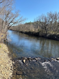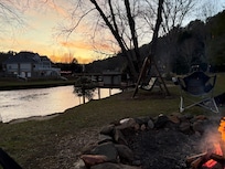 Our cabin is a true riverside retreat, offering a rare combination of serenity, natural beauty, and outdoor fun. One of its most unique features is the rocky fish trap in the river behind our house, which creates a soothing, gentle flow of water - perfectly enjoyed from the large river deck or the spacious screened-in back porch. As the sun sets over the river, the view looking downstream is breathtaking, casting golden hues over the water.