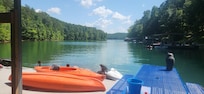 The outdoor living space is perfect for the lake. We have almost 2000 SF of deck space, several of the areas being under cover. New steps and two new decks were added in 2016, making the walk to the water a breeze. One of the new decks is right at the water’s edge. Outdoor furniture and an offset umbrella make this deck a perfect place to sit in the shade and watch the kids play in the water. The steps leading to the lake are winding, wide, and beautifully lit. The private dock easily accommodates 3 boats. Two paddle boards and two kayaks are also provided for your enjoyment.