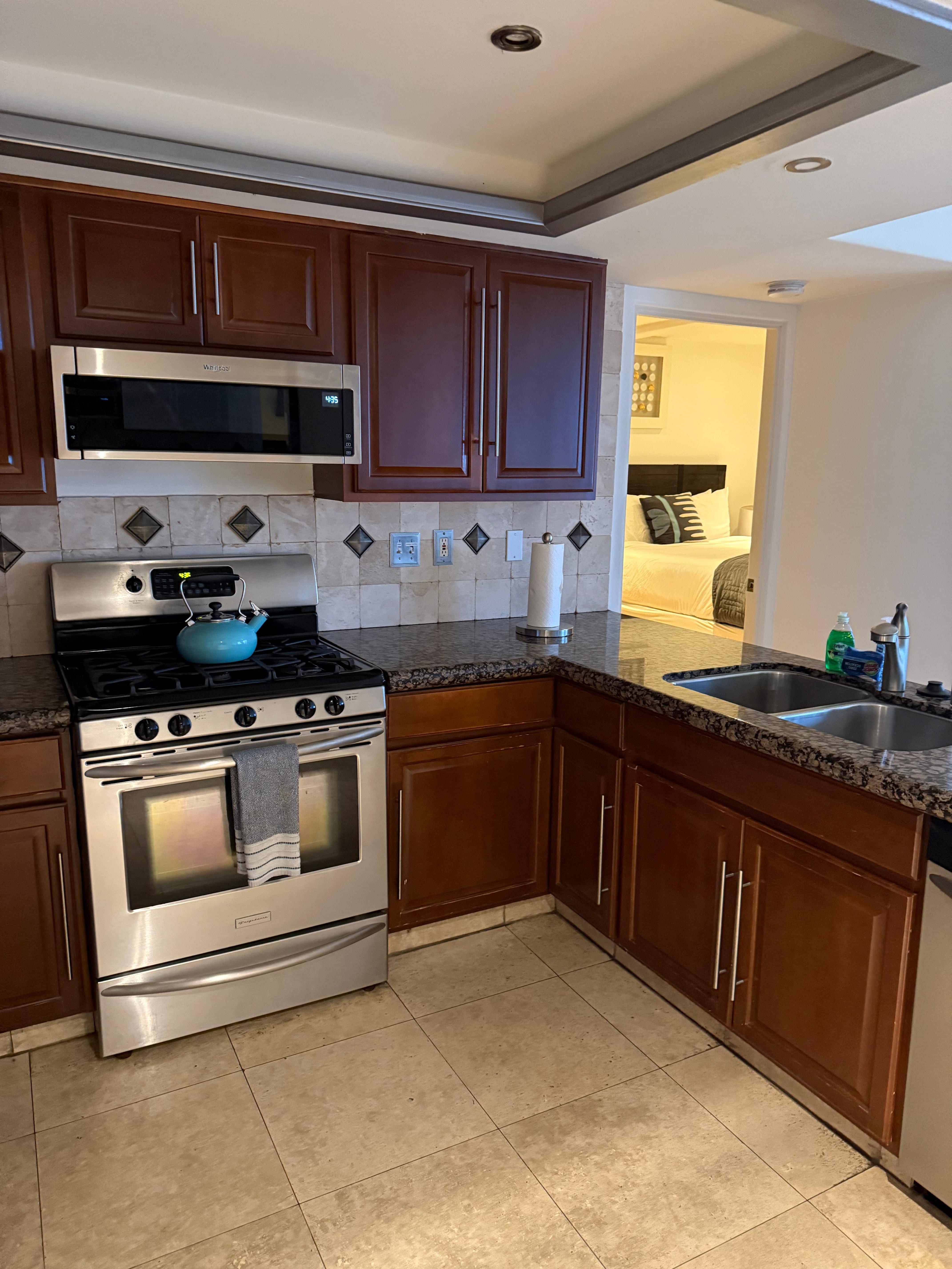 Furniture includes 2 plush sofas that seats 6 people, a dining nook for 4, and a gorgeous 60" wall mounted TV located in the main living area. The Master bedroom features a casual styled collection built with solid wood, modern Queen bed, drawer set lined with microfiber to protect your delicate belongings, 40" flat screen TV, his & hers closets, and a full ensuite bathroom equipped with tub/shower combination & dual sinks. The second bedroom houses a Cal-King bed with it's own 50" TV & huge double wide closet. Rounding out the home is a second full bath (shower/tub combo) with stackable washer/dryer.